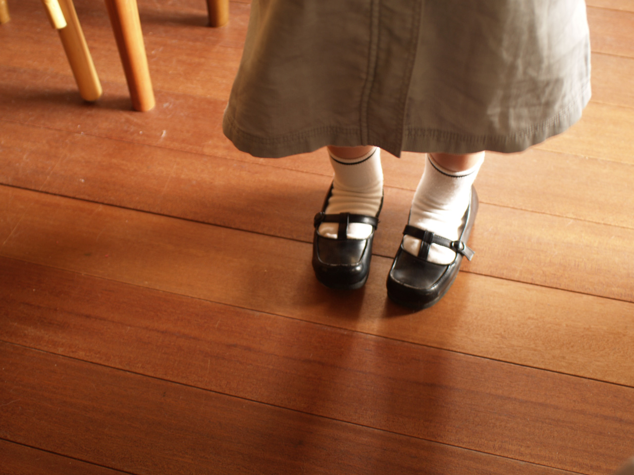 本日のありえない。突然、土足で生活する娘。海曰く「ちゃちゃーっと幼稚園いけるけん」とのこと。