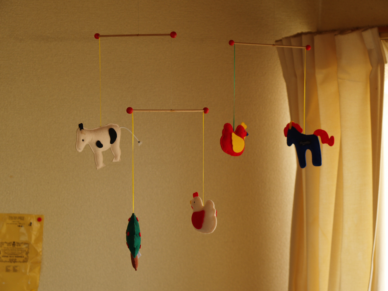 寝室につけておいたモビールは誰も見てなかったので、仕事机のすぐよこのソファーの上に吊るして僕がうたたねしつつ眺めている。とてもよく眠れるのでまずい。