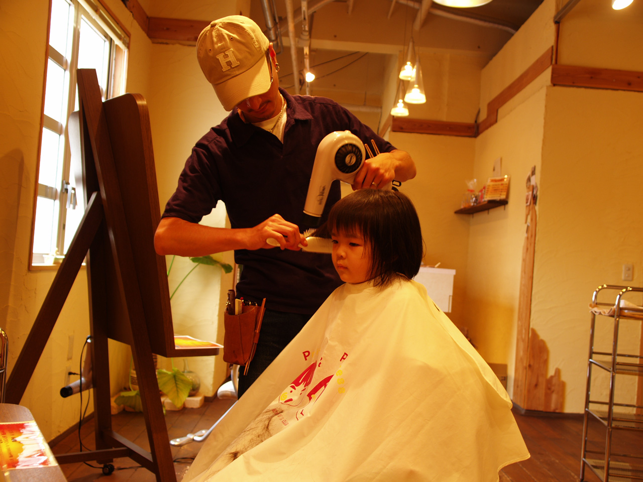 初の美容室でかたまる海。と頭にタオルをまいたままカメラを構える俺。