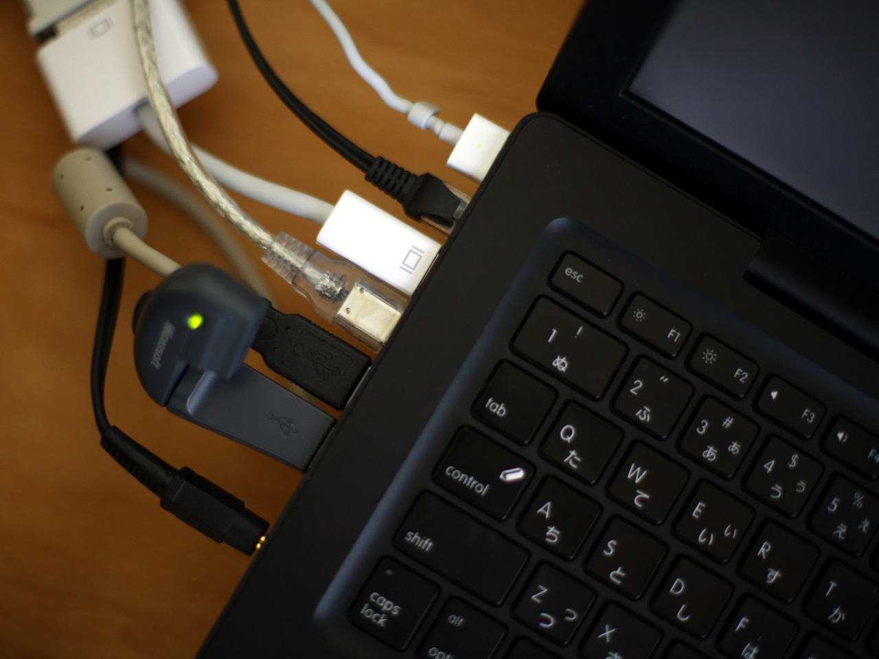 事務所でのMacBook。繋ぎ過ぎなのだった。(上から、電源、LAN、モニタ、ハードディスク、プリンター、マウス、スピーカー)