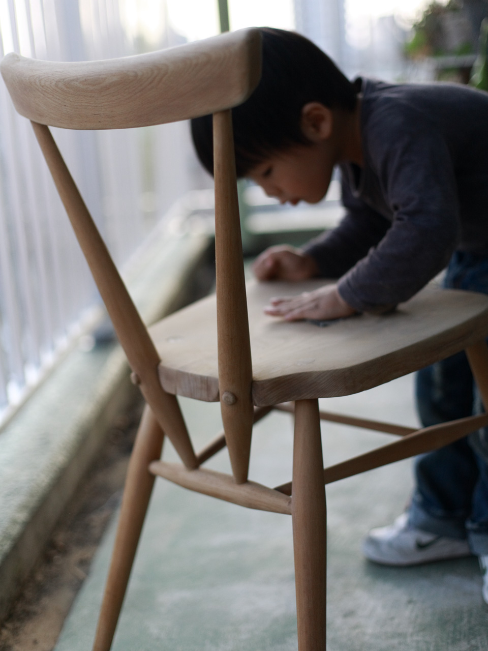 オイル仕上げにするべく、アーコールチェアをヤスリがけ。を手伝う空。