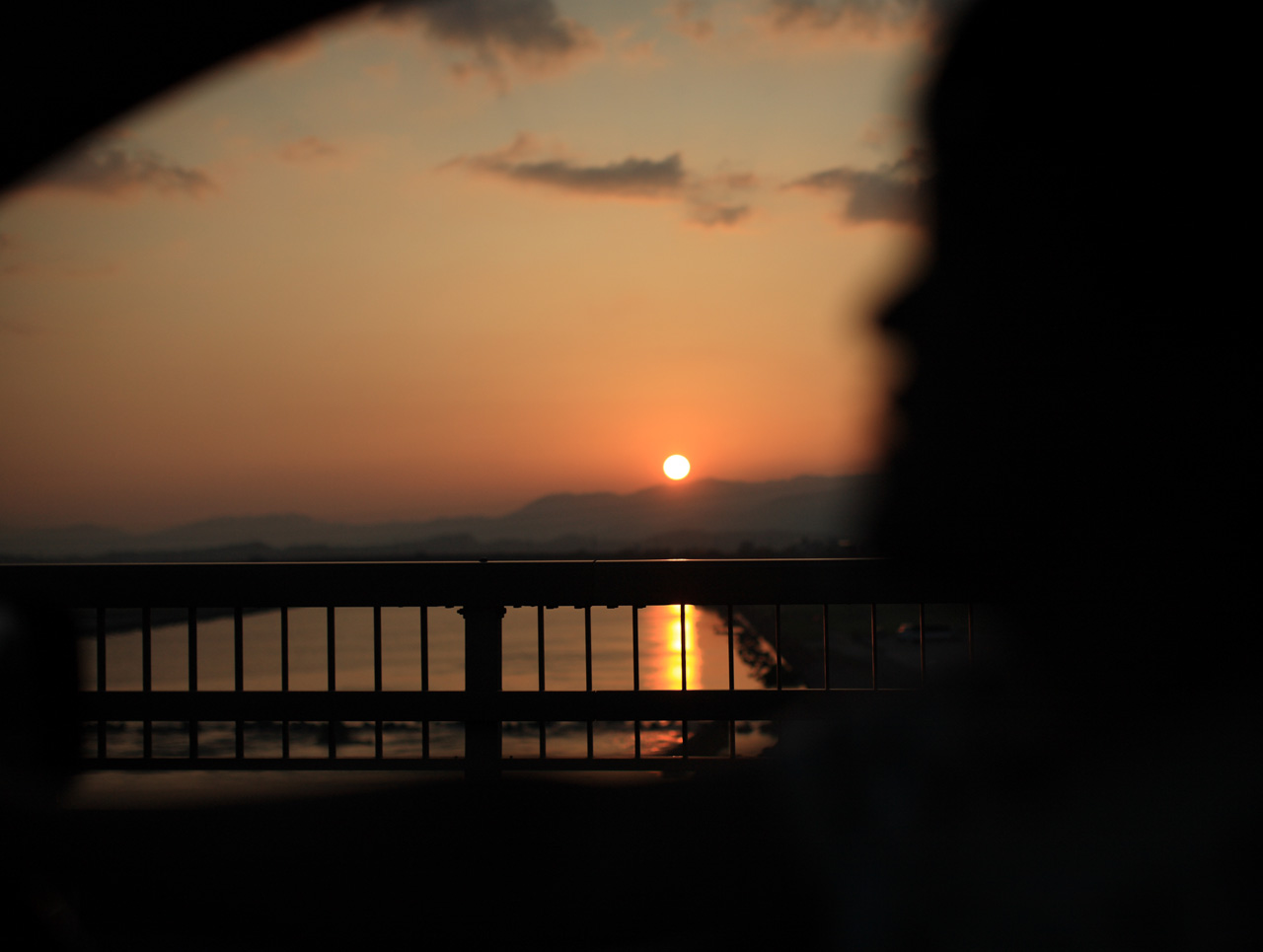 車の中から、橋の上の夕日。