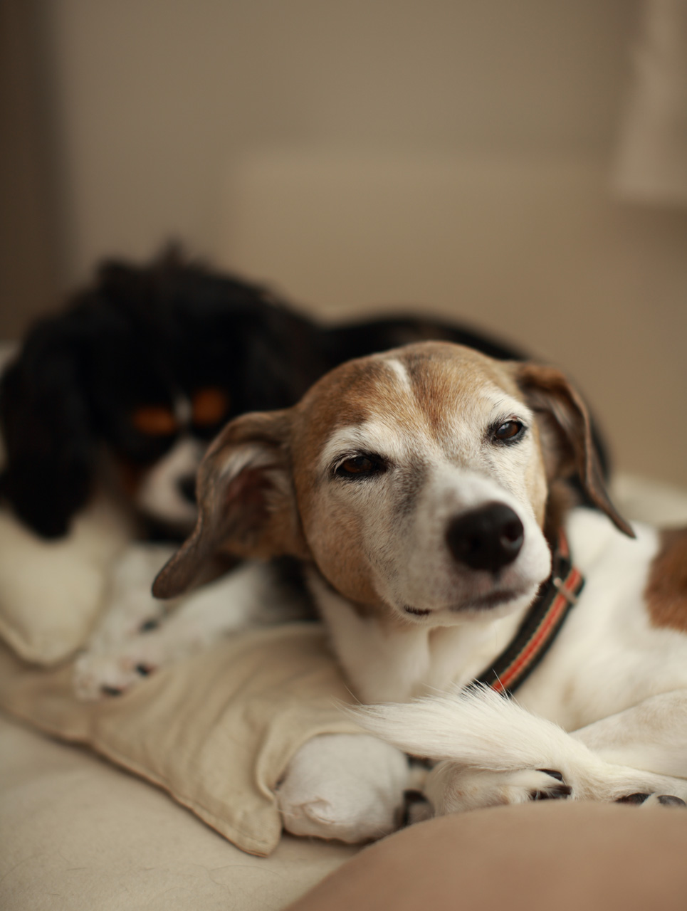 パンの耳(右足前の白いの)を狙うハトにマッチアップするヨメ。
